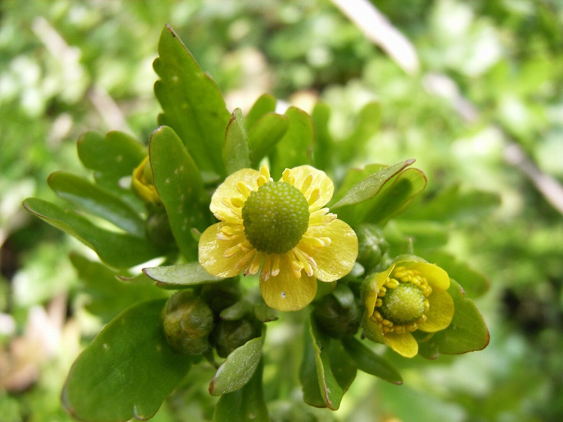 噛むと辛くて「田辛し」なのか?田んぼを枯らす「田枯らし」なのか?有毒ですが、黄色の光沢のある花びら、やがて実になる中央の緑色の玉がとても印象的な植物です。水面に照り映える姿も良いですよ。似た種に、葉に毛がある『ケキツネノボタン』があります。