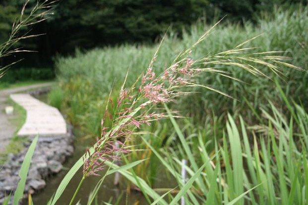 お盆の時に盆棚に敷く盆ござ(コモ)を葉で編むからマコモという名だそうです。触ってみると、淵は少し鋭いですが、ひらたい葉っぱはしっかりとしたたのもしさがあります。大きな花がドーンと出ると、根木内に夏が来たのだなぁと感じ入ります。